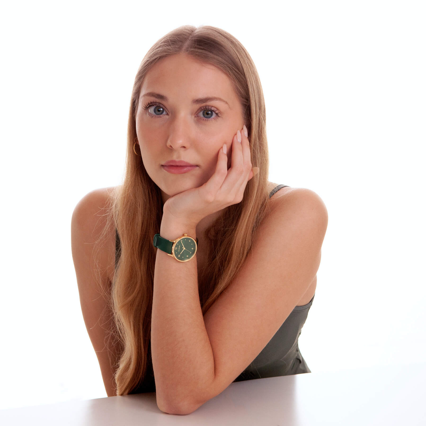 - Dial: グリーン仕上げの円形メタルの文字盤にゴールドインデックスと針