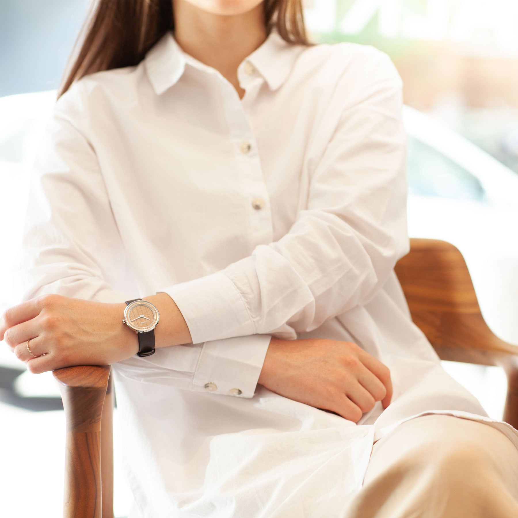 桜の木の時計を身に付けて、その美しさを毎日の生活の中で感じてみませんか。 スリムでエレガントでありながら、個性的な面も兼ね揃えたデザインの時計です。 木の温かみが、唯一無二の存在感を放ちます。