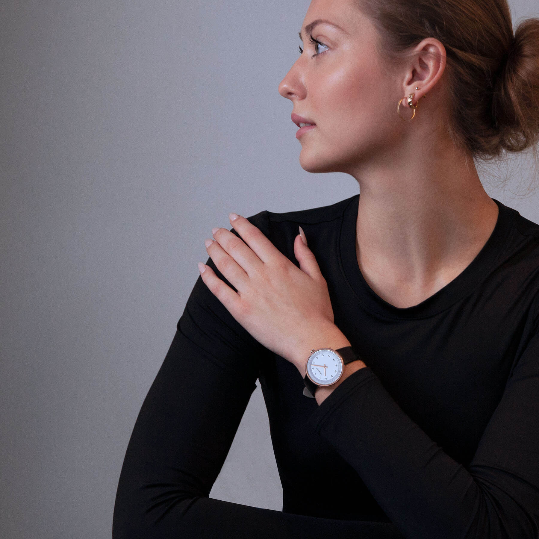 砂吹き仕上げのホワイトダイヤルは、ポプラ材の円によって上品に縁取られ、優雅な温もりと洗練された印象を演出します。耐久性に優れたポプラ材が、日常使いにもふさわしい強靭さを備えています。黒く際立つアワーマーカーとローズゴールドの針が、視認性を高めつつ、上品なアクセントに。気分や装いに合わせて、ストラップは道具を使わずに簡単に交換でき、自由なスタイルを楽しめます。